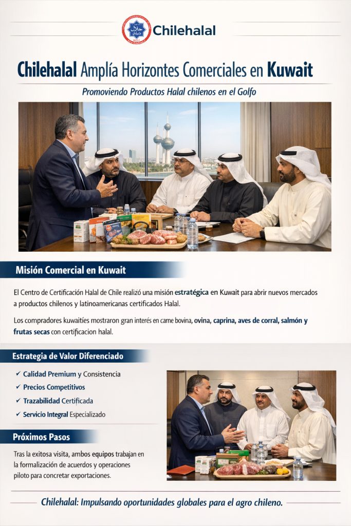 El Centro de Certificación Halal de Chile – CHILEHALAL llevó a cabo una misión comercial estratégica en Kuwait con el propósito de fortalecer la inserción de empresas chilenas y latinoamericanas certificadas halal en el dinámico mercado del Golfo.